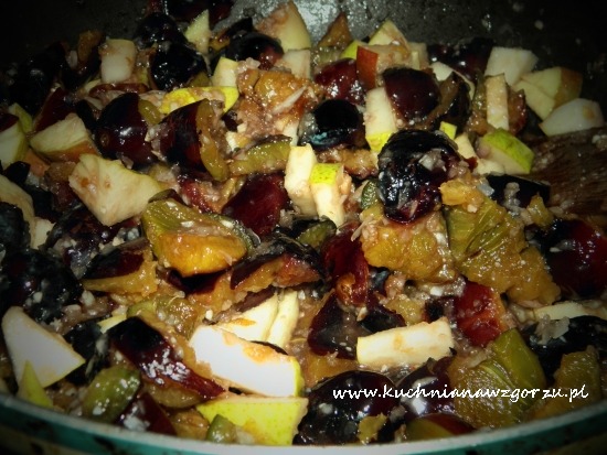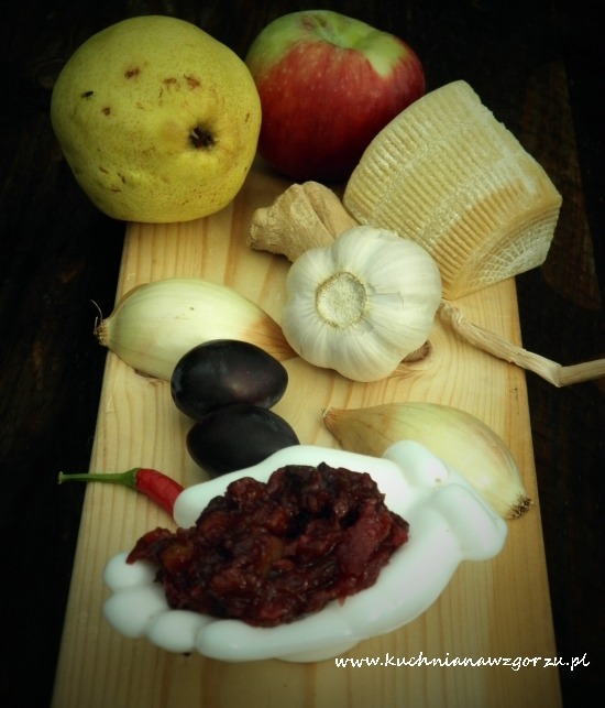 Cebulę i czosnek obieramy i kroimy bardzo drobno, jabłko i gruszkę myjemy pod wodą i kroimy w kosteczkę. Imbir obieramy i kroimy drobno. Na patelnię dajemy śliwki wraz ze wszystkimi składnikami. Gotujemy około godzinę, bardzo często mieszając. Aż wszystko dokładnie się rozgotuje, wymieszają się przepyszne smaki. Potem pakujemy całość do wyparzonych słoiczków. A w zimie otwieramy słoiczek i jemy go np. jako dodatek do serów. Oj, pyszne !
