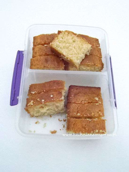 Wyjąć ciepłe ciasto i polać je syropem, ostudzić. Kroić na nieduże kawałki.