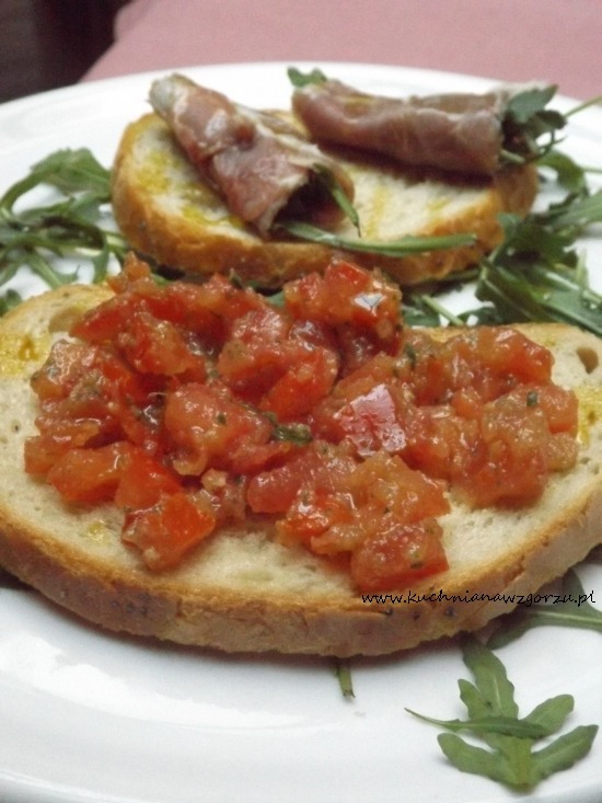 Na początek crostini misti: chrupiące grzanki z pesto ze świeżymi pomidorami, szynką parmeńską i rukolą – bardzo smaczne z dużą ilością świeżej rukoli, co bardzo lubimy