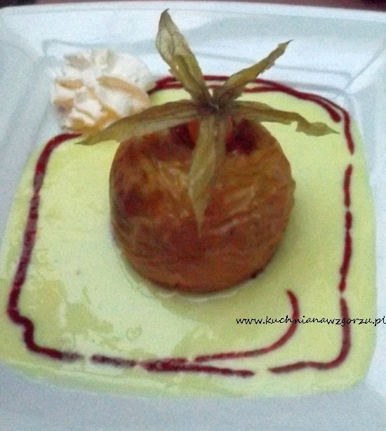 Oraz jabłko pieczone z żurawiną i cynamonem w sosie waniliowym,
