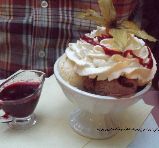 Lody z gorącymi wiśniami. Naprawdę bardzo smaczne lody, fajnie podane i pyszny sos.