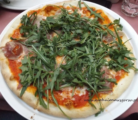 W między czasie pan kelner przyniósł nadprogramową ( nie było jej w grouponie ) naszą ulubioną pizzę czyli prosciuto di parma ( sos pomidorowy, mozarella, szynka parmeńska, rukola) i znowu plus – smaczne cienkie ciasto, dużo rukoli, dobra szynka, jednym słowem polecamy.