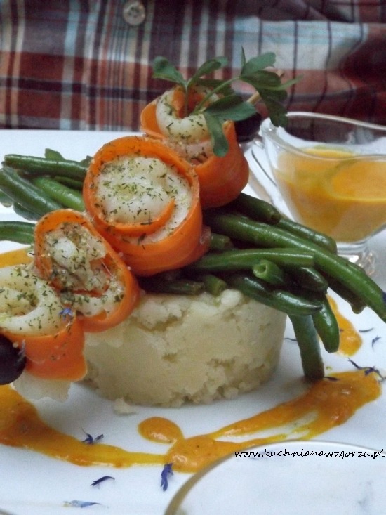 Pyszna delikatna ryba zawinięta w paski marchewki, ułożona na puree ziemniaczanym z bardzo dobrym sosem – zdecydowanie pyszne danie.