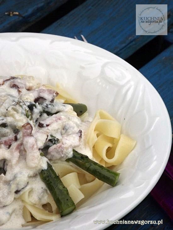 Nakładać na talerz makaron, szparagi i na to sos. Pyszne, zdecydowanie nie dietetyczne,ale warte grzechu :)