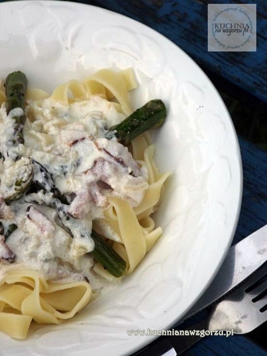 Szparagi upiec w piekarniku. Makaron ugotować wg przepisu na opakowaniu. Cebulę pokroić w drobniutką kosteczkę. Na patelni rozgrzać olej i podsmażyć lekko cebulę wraz z pokrojonym boczkiem dodać pokruszone sery i wymieszać dodając powoli śmietanę. Wymieszać i dusi do rozpuszczenia serów, doprawić pieprzem ( sery powinne same w sobie być lekko słone ) .