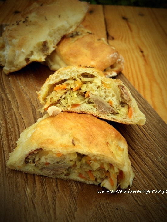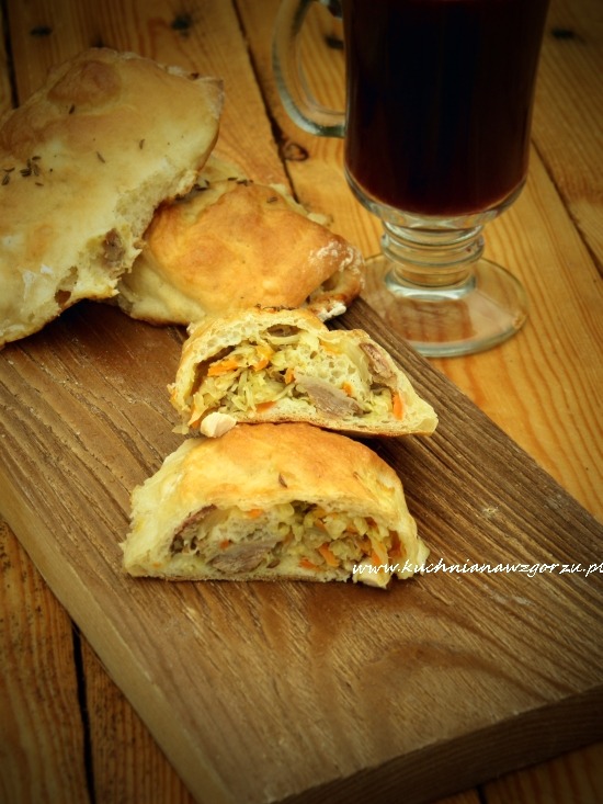 Robimy zaczyn z drożdży, cukru i mleka, czyli porządnie wszystko mieszamy. Po ok. 15 minut do zaczynu dodać mąkę, jajko i wszystko porządnie wymieszać. Ciasto może być lekko kleiste ale to nie szkodzi. Zostawiamy w misce w ciepłym miejscu przykryte ściereczką, aż podwoi swoją objętość. Po tym czasie wyciągamy ciasto na stolnicę ( obsypaną mąką ) jeśli ciasto się klei możemy dosypać troszkę mąki i zagnieść ciasto. Potem ciasto rozwałkowujemy na prostokąt i przecinamy przez pół a potem każdy z naszych pasków na 10 cm prostokąty, na każdy prostokącie kładziemy nadzienie i zwijamy ( tak jak rulon ) odkładamy na blachę wyłożoną papierem do pieczenia, smarujemy jajkiem i posypujemy kminkiem. Pieczemy ok. 20 minut w piekarniku nagrzanym do 180 C.