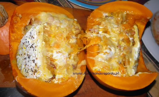 A teraz bierzemy naszą wydrążoną dynię i wkładamy do niej pierwszą warstwę czyli boczek z dynią, druga warstwa to 2 plasterki sera camembert a trzecia to 2 łyżki śmietany z czosnkiem, tak do końca warstwami wypełniamy dynię. Na samą górę ja dałam porwane plasterki sera żółtego, śmietanę z czosnkiem i pół łyżki dobrej oliwy z oliwek oraz świeżo zmielony pieprz.