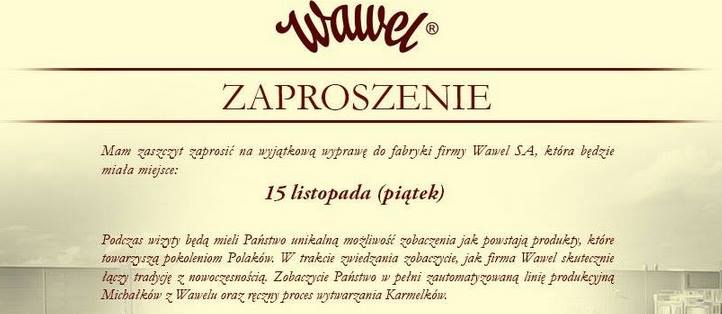A dzisiaj będzie dzień słodyczy .. czyli spełnienie marzenia chyba każdego dziecka ( dużego też ;)) czyli zwiedzanie fabryki czekolady dzięki zaproszeniu do fabryki Wawel SA. Oj, słodkości nadchodzę a dokładnie nadchodzimy w towarzystwie innych blogerek i blogerów.