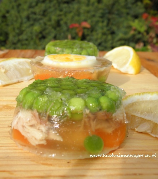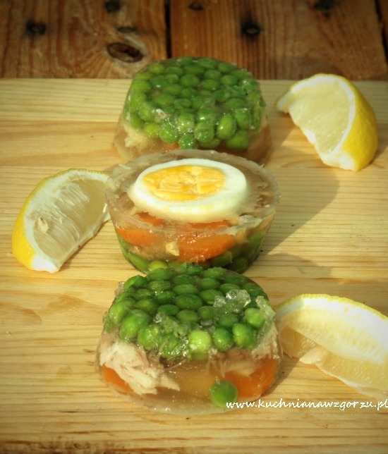 Dół foremek do muffinek wyłożyć groszkiem na to układać mięso z rosołu i na to na wierzchu plasterek jajka. Zalewać rosołem wymieszanym z żelatyną, wg przepisu z opakowania.