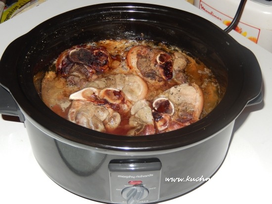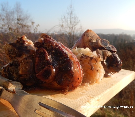 W ceramicznym naczyniu ułożyłam kapustę, zalałam sokiem, posypałam sporą ilością kminku dodałam trochę pieprzu, ułożyłam umyte golonki, przykryłam pokrywką i wstawiłam na program low o godzinie 19.00 i o godzinie 8.00 rano golonki były miękkie i pyszne. Zostały podane na obiad, więc o 12.00 włączyłam program high i o 14.00 wyjęłam i podałam je na obiad. Były pyszne, mięso odchodziło od kości, było delikatne i pyszna uduszona kapusta.