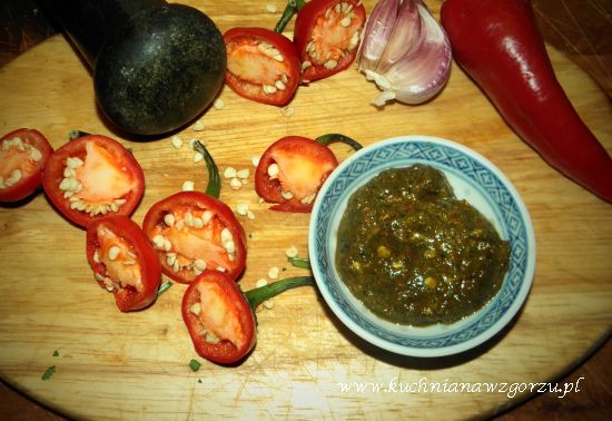 Papryczki tniemy na mniejsze kawałki, przekładamy do miksera ( z ostrzami ) dodajemy pokrojoną kolendrę, obrany czosnek, sól. W moździerzu rozbijamy kolendrę i kumin i dodajemy do papryczek. Wszystko razem miksujemy i na końcu wlewamy oliwę i jeszcze raz miksujemy. Gotową mieszankę przekładamy do słoika. Uwaga ! ta mieszanka jest mega ostra.