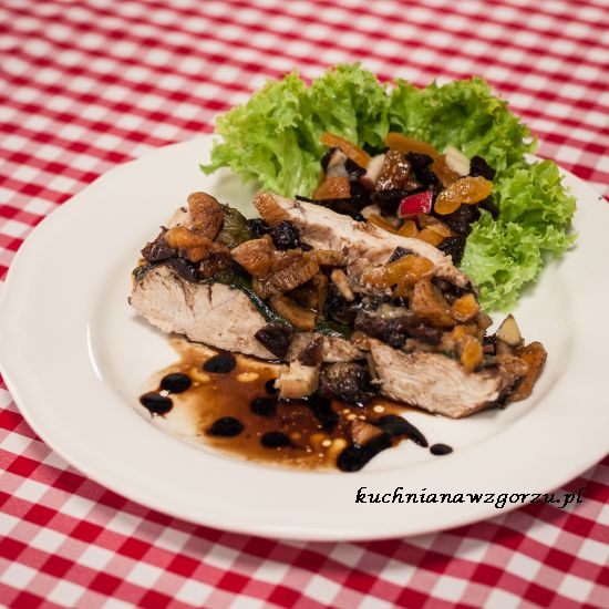 Pierś z kurczaka przekroić wzdłuż na pół ( ale tak żeby były dwa płaty ), lekko ją ponacinać nożem. Morele, śliwki drobno posiekać. W miseczce wymieszać wino, ocet, miód, paprykę, skórkę z cytryny i do tego przełożyć morele i śliwki, odstawić na 20 minut, żeby owoce nasiąkły płynem. Filet z indyka ułożyć na folii aluminiowej nasmarować od wewnątrz sosem spod owoców. Na filecie rozłożonym ułożyć najpierw szpinak ( bez twardych ogonków ) potem owoce z sosem, dolać sosu. Zawinąć filet szczelnie w folię. Odłożyć na 30 minut, potem ułożyć na grillu lub w piekarniku ( temp. 200 C) i piec ok. 25 minut, rozciąć folię od góry i pozwolić mięso dojść. U nas po takim czasie było gotowe, ale to był grill gazowy, więc trzeba popróbować. Podawać z owocami.
