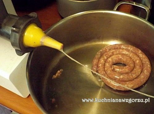 Jelita naciągamy kawałkami na nasz lejek od maszynki. Dzielimy jelita na kawałki, koniec każdego kawałka wiążemy na supełki. Do maszynki wkładamy mięso ( już bez ostrzy w środku ) i nadziewamy jelita. I gotowe.