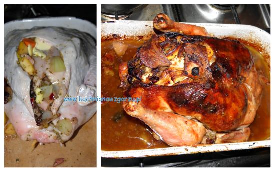 To wszystko w kolejności oliwa rozgrzana, masło, boczek – podsmażyć, dorzucić czosnek, cebulę – podsmażyć. Dorzucić resztę i chwilę wszystko podsmażyć na koniec podlać czerwonym wytrawnym winem – chwilkę poddusić. Tym nafaszerować kurczaka w środku, jak i na piersiach pod skórą. Piekłam ok. półtorej godziny w dobrze nagrzanym piekarniku. Potem wyjęłam przełożyłam do innej formy, owinęłam folią aluminiową i zabrałam do raju. A w raju jak dzieci po sankach zostały zwołane .. kurczak zniknął.. pożarty został w sekundę.