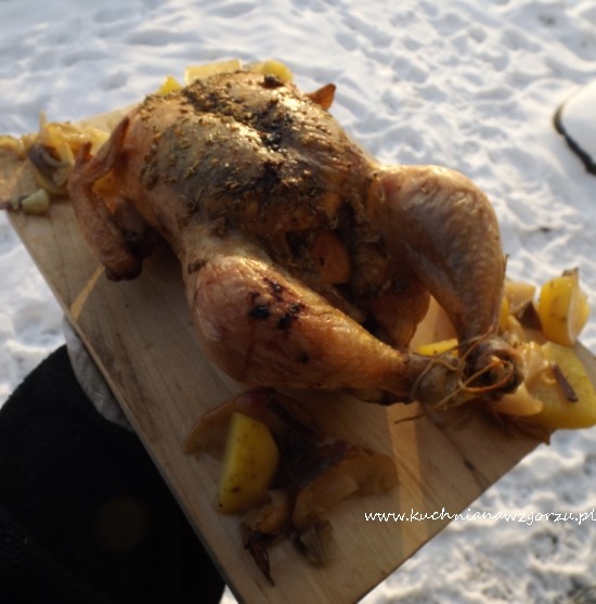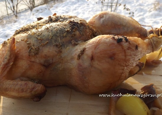Kurczak umyć pod zimną wodą, osuszyć. Czosnek obrać i zmiksować z oliwą, majerankiem i rozmarynem, doprawić dużą ilością soli, oraz pieprzem do smaku. Pod skórę kurczaka na piersiach włożyć czosnek i posmarować go również na skórze. Jabłko umyć pokroić na ćwiartki, wykroić gniazda nasienne i włożyć do środka kurczaka, zawiązać nogi. Wstawić do zimnego piekarnika i nastawić na 220 C piec prze 40 minut, potem zmniejszyć temperaturę do 180 C i piec jeszcze przez półtorej godziny. Podawać gorącego, u nas dodatkiem były pieczone ziemniaki, z cebulę, rozmarynem i jabłkiem.