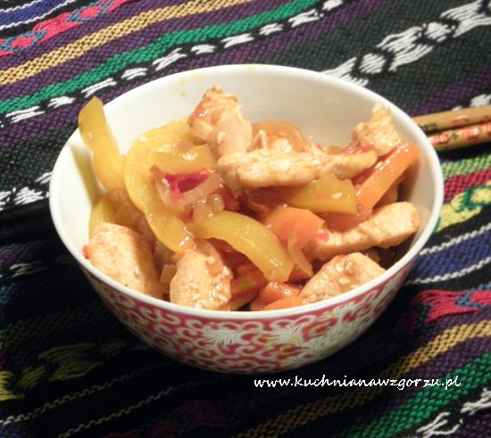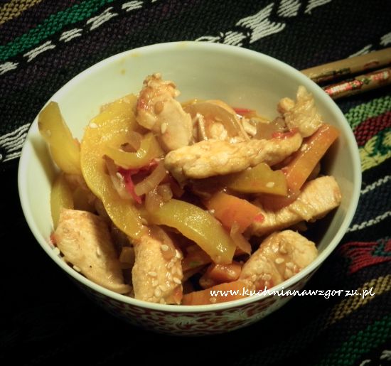 Marchewkę obieramy i kroimy w pół plasterki, cebulę obieramy i kroimy w półplasterki, czosnek i imbir obieramy i drobno kroimy. Rozgrzewamy olej na patelni i przesmażamy cebulę z czosnkiem i imbirem, po chwili dodając marchewkę, po chwili dodajemy pokrojoną w miarę drobno paprykę. Wszystko razem przesmażamy, przekładamy z patelni do miseczki – mieszamy z olejem sezamowym. Pierś z kurczaka myjemy, osuszamy i kroimy w paseczki. Przesmażamy na patelni z sosem chili, oraz sosem sojowym dodając przesmażone wcześniej warzywa. Posypujemy sezamem mieszamy i gotowe.