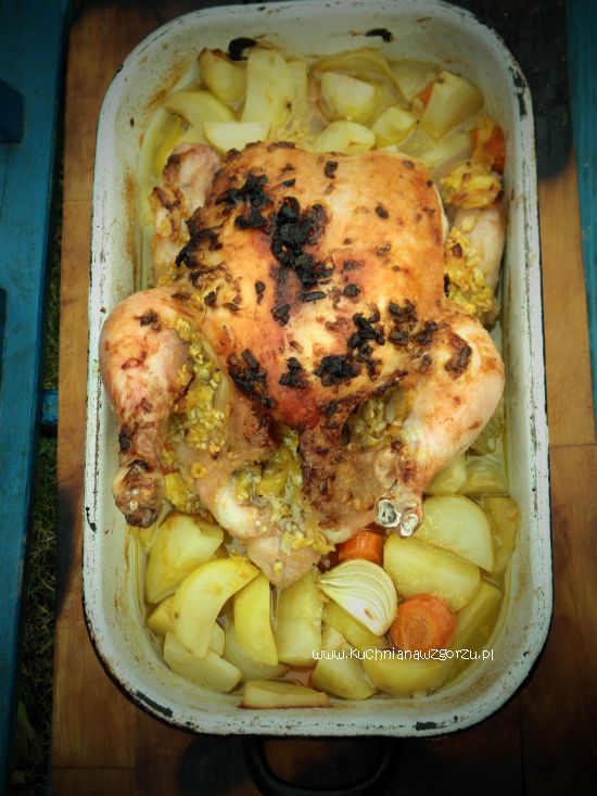 Ostatnie tygodnie pędzą, lecą .. mijają bezszelestnie wręcz, ale przychodzi taki dzień kiedy nic nie trzeba. Tak było wczoraj, sobota, wolna bez obowiązkowych wyjść, spotkań .. sobota do leniuchowania. A mi zamarzył się kurczak pieczony w całości. Normalnie przyrządzamy kurczaka najprostszego z solą i czosnkiem, ale wczoraj gdzy przygotowałam ten miks, pod ręce (same) weszły mi .. inne składniki i tak powstał. Delikatny, pachnący lekko słodki kurczak.