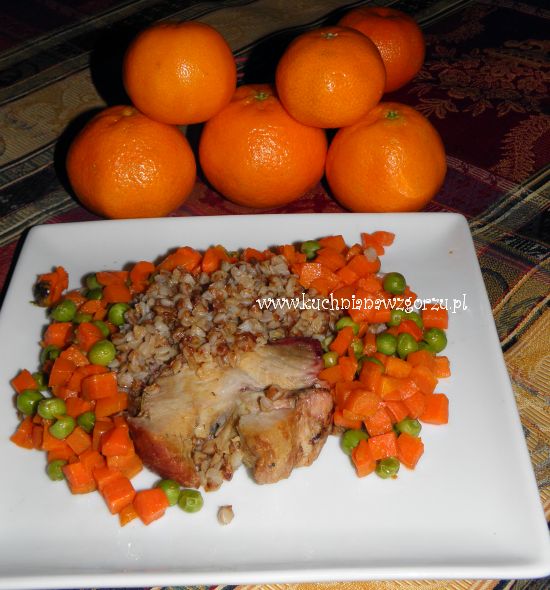 U mnie na obiad została podana z kaszą gryczaną i marchewką z groszkiem.