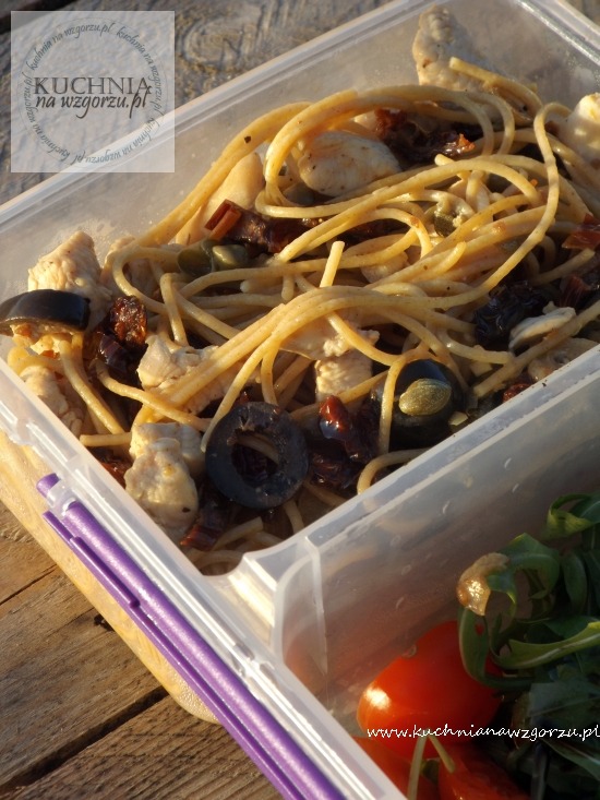 Makaron razowy spaghetti z oliwkami, kaparami, piersią z kurczaka .. czyli pomysł na przepyszny obiad do pracy. Makaron razowy czyli makaron wyprodukowany z mąki z pełnego przemiału, który dostarcza naszemu organizmowi więcej dobrych składników w czasie diety, takich jak mikroelementy, witaminy, błonnik tak ważny w diecie. Makaron ten sprawia, że poziom cukru we krwi wzrasta znacznie wolniej. Makaron ten trawimy wolniej przez co długo czujemy się syci i nie musimy podjadać. ( sprawdziłam nie raz i działa). Do mojego makaronu dodałam też odrobinę chilli w proszku żeby podkręcić spalanie tłuszczu w organizmie. Czyli teraz czas na przepis.
