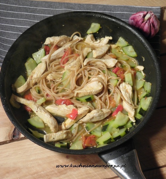 Makaron gotuję al’ dente. Cukinię obieramy w paski, kroimy ją na półplasterki. Czosnek kroimy drobno, pomidorki kroimy na ćwiartki. Na patelnie dajemy łyżkę oliwy i podsmażamy warzywa. Pierś z kurczaka kroję w paski i dodaję po chwili do warzyw i całość razem podsmażam dodając łyżeczkę musztardy francuskiej, ewentualnie podlewając łyżką wody i na końcu dodajemy pomidorki koktailowe i całość jeszcze chwilę dusimy. Na koniec dodajemy makaron. Mieszamy i gotowe. Po przestudzeniu pakujemy do pojemnika na lunch i wkładamy do lodówki. A następnego dnia bierzemy pudełko do pracy i mamy pyszny obiad w pracy.