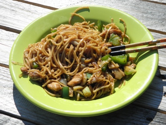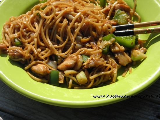 Pałki z kurczaka myjemy pod zimną wodą, osuszamy, ściągamy skórę, i zdejmujemy mięso z kości. Kroimy w średniej wielkości kawałki. Cebulę obieramy i kroimy w piórka, paprykę myjemy i kroimy w kostkę. Imbir kroimy w miarę drobno, czosnek obieramy i kroimy w kosteczkę. Makaron przygotowujemy wg instrukcji na opakowaniu. Na patelni rozgrzewamy olej kokosowy i przesmażamy czosnek z imbirem, po chwili dodajemy cebulę, pora i kurczaka, całość polewamy sosem teriyaki, dodajemy po chwili dodajemy paprykę i wszystko razem smażymy. Pod koniec smażenia dodajemy sos sojowy i wszystko mieszamy i smażymy chwilkę. Po zdjęciu patelni z kuchenki całość doprawiamy olejem sezamowym i sezamem, mieszamy i gotowe ! Smacznego !