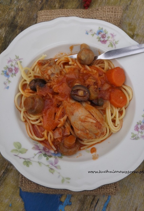 Na głęboką patelnię wlewamy olej i obsmażamy na nim pałki z kurczaka, zdejmujemy je i przekładamy do garnka. Na patelnię do oleju dodajemy pokrojone masło, wrzucamy czosnek i lekko dusimy, dodajemy pokrojone warzywa, całe pieczarki i wszystko razem dusimy ok. 10 minut, potem dodajemy pałki z kurczaka, zmiksowane pomidory z puszki, sos pomidorowy, kapary i oliwki, mieszamy i gotujemy pod przykryciem ok. 40 minut, doprawiamy do smaku i podajemy z ugotowanym makaronem spaghetti.