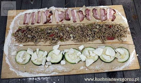 Ciasto rozwałkowujemy na prostokąt – kroimy w trzy paski, na każdym z nich układamy jedno nadzienie, paski układamy jeden na drugim i kroimy w kwadraty – wkładamy do foremki keksowej wyłożonej papierem do pieczenia. Odstawiamy do wyrośnięcia.