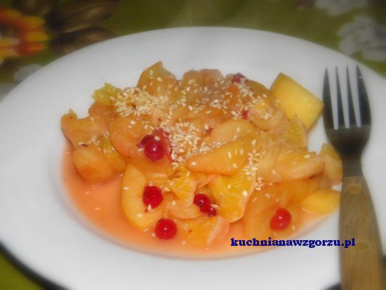 I wróciłam dzisiaj do jabłek na ciepło z dodatkiem pomarańczy oraz żurawiny. Wszystko to podgrzałam na patelni z łyżeczką wody, oraz odrobiną masła klarowanego. Jabłka zaczęły się rozpadać, żurawina też, a pomarańcze lekko się skarmelizowały pod wpływem swojego soku, jak i odrobiny cukru brązowego. Na samym końcu dorzuciłam kilkanaście sztuk żurawiny. Lekko poddusiłam i na talerze przełożyłam, posypałam sezamem. Mniam, pyszne ! polecam :)A może możecie się ze mną podzielić pomysłami na śniadanie które najchętniej nie zawiera jajek, chleba i parówek ;) ooo :):)