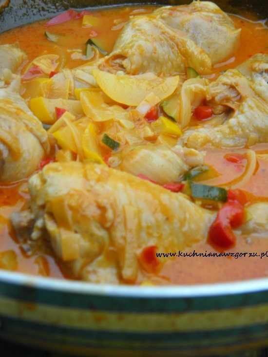 Cebulę obrać, pokroić w piórka. Pora obrać pokroić w półplasterki, cukinię pokroić w paseczki, czosnek obrać drobno posiekać, paprykę pokroić w kosteczkę. Na patelni rozgrzewamy olej, na dobrze rozgrzany olej wrzucamy czosnek, cebulę i pora przesmażamy całość ok. 5 minut. Zdejmujemy z patelni. Na patelnię wkładamy pałki z kurczaka i obsmażamy szybko. Po chwili dodajemy do pałek cebulę, cukinię, paprykę i zalewamy mieszanką pasaty, mleczka kokosowego, curry i wody. Zakrywamy pokrywką, gdy tylko całość się zagotuje zmniejszamy gaz i gotujemy pod przykryciem ok. 30 minut, aż mięso będzie miękkie i ugotowane. Pyszne i aromatyczne danie.