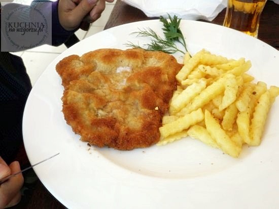 Michał jak to on zamówił kotlet schabowy z frytkami i mizerią. Po chwili od zamówienia usłyszeliśmy odgłosy rozbijanego mięsa .. to był dobry znak. Kotlet pyszny, świeżo usmażony po prostu palce lizać.