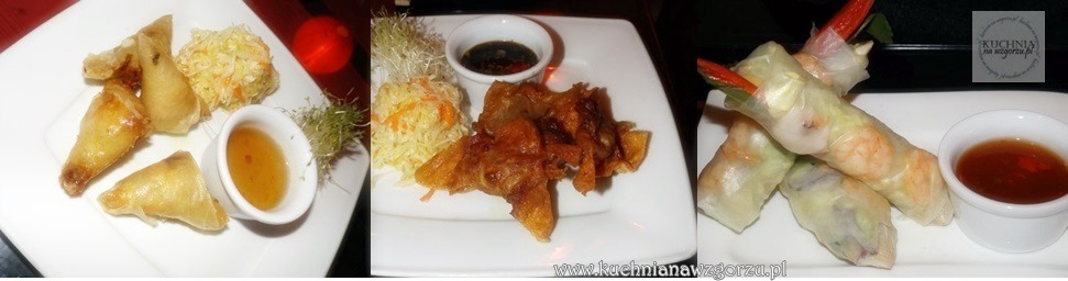 Na przystawkę mieliśmy – sajgonki z krewetkami i świeżymi warzywami – takie, mimo że za krewetkami nie przepadam mogłabym jeść codziennie ;). Nem- czyli chrupiące sajgonki z mięsem – równie smaczne, oraz chrupiące pierożki won ton z sosem chili. Dobre to było. m