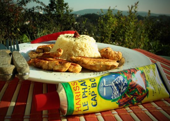 A w południe słońce, ale chwile wcześniej zamarynowałam piersi z kurczaka w harissie* mojej ulubionej od czasu kiedy dawno temu byłam w Tunezji. Uwielbiam jej ostry smak, a mięso marynowane jest genialne.