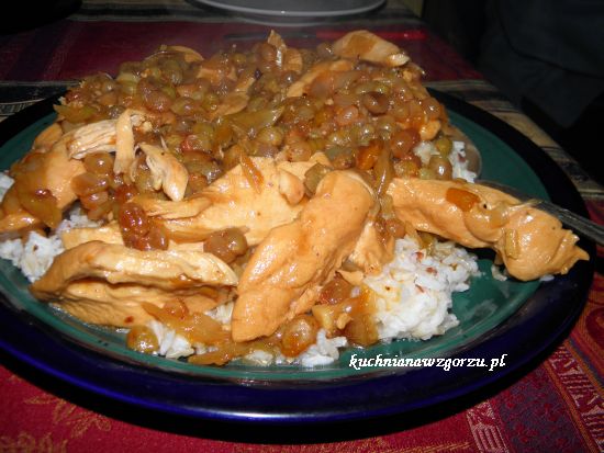 Na obsmażone z dwóch stron piersi z kurczaka wrzuciłam i równo rozłożyłam cebulę z czosnkiem. Całość zalałam mieszanką ze słoika i dodałam rodzynki. Zmniejszyłam gaz, przykryłam patelnię pokrywką i pojechałam przez śniegi po córkę do szkoły. Wróciłam po 10 minutach, danie było pachnące i gotowe. Boskie w smaku, lekko kwaśne ale z przeważającą nutą słodyczy. Do tego ryż i już :)