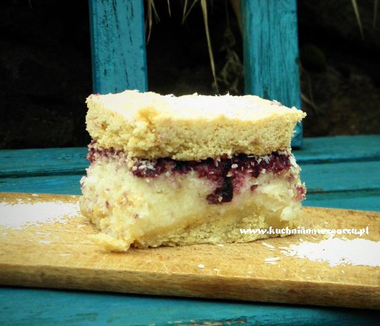 W formie układamy pierwszy blat na niego dajemy masę kokosową, potem dajemy dżem porzeczkowy i kładziemy drugi blat ciasta.
