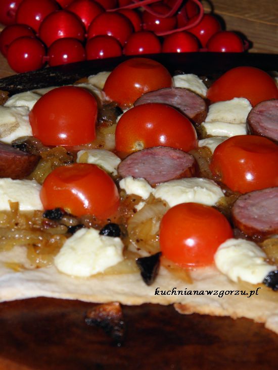 Na cieście ułożonym na gorącym kamieniu rozłożyć cebulę ze śliwkami, poukładać w kawałeczkach bryndzę, plasterki kiełbasy lisieckiej, ułożyć pomidorki pokrojone na pół. Wstawić do nagrzanego piekarnika i piec maks. 15 minut ( po 10 minutach pizza powinna być gotowa ). Podawać od razu.