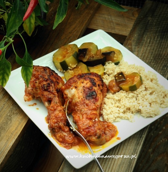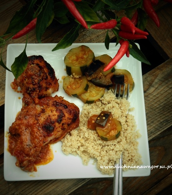U mnie kurczak został podany z kuskusem oraz z duszoną cukinią i bakłażanem .