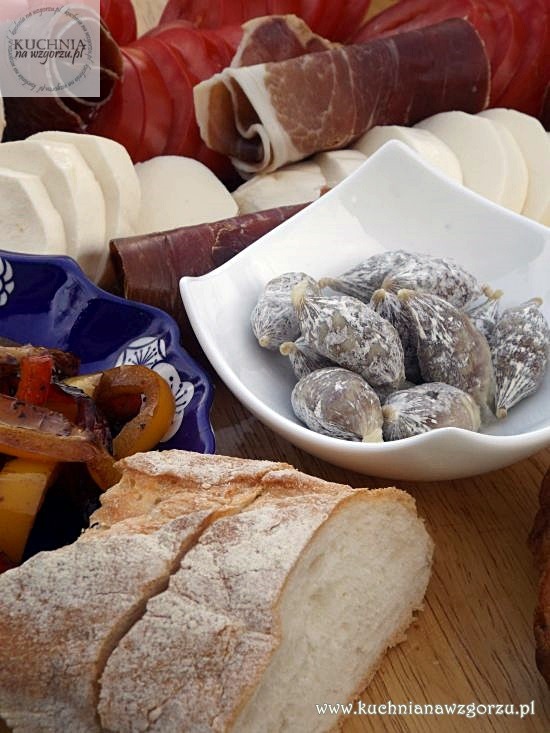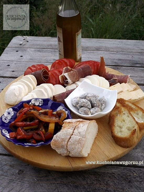 Wszystko razem układamy na desce / talerzu i podajemy z oliwą którą możemy nalewać na talerzyk i moczyć w niej bagietkę.