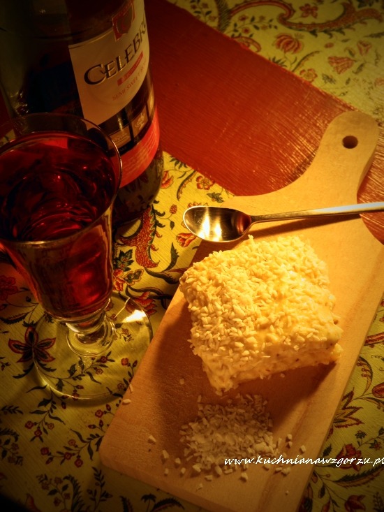 Ciasto jest pyszne, wilgotne i nie za słodkie ale pełne aromatu kokosa i migdałów, a do niego kieliszek delikatnego różowego wina Celebro i już jesteśmy w raju.