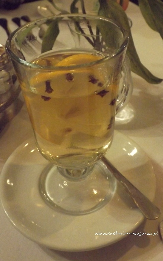 Zostaliśmy przywitani przez bardzo sympatycznego pana kelnera, który wskazał nam stolik, pomógł ściągnąć kurtkę i podał nam karty, a w kartach dobre rzeczy do wyboru. Jako, że jak wspomniałam na polu było zimno ja poprosiłam o Krupnik Antoniego (13 zł ) czyli ciepłe białe wino z dodatkiem krupniku i cytryn z goździkami, pyszne, rozgrzewające.