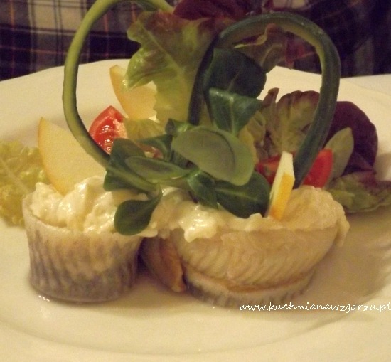 Na przystawkę J. wybrał ” tradycyjnego matjasa w śmietanie z cebulą i jabłkiem” (13 zł ), pyszny delikatny z bardzo dobrą delikatną cebulą i lekko słodkawym jabłkiem.