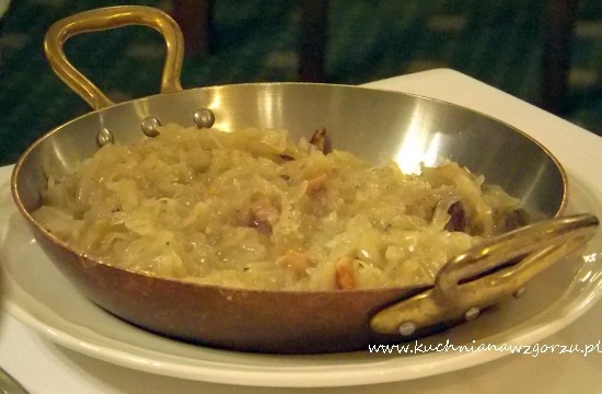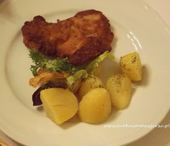 J. wybrał klasycznie czyli tradycyjny kotlet schabowy z kością podawany z kapustą zasmażaną, ziemniakami z wody z masłem i świeżym koperkiem ( 36 zł ). Pyszne mięso z małą kostką, usmażone na smalcu, świeże, pyszne.