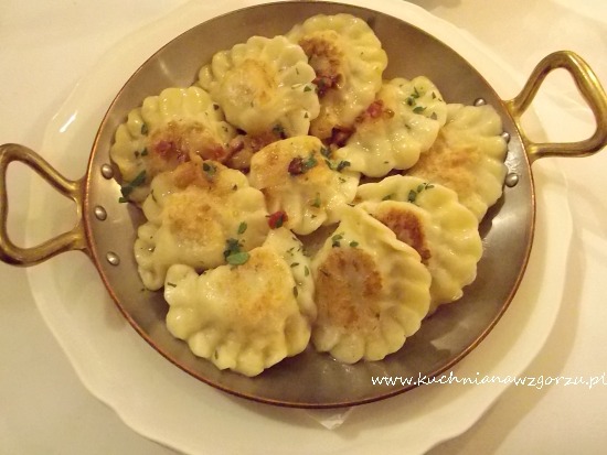 Ja zupę odpuściłam i oczekiwałam na moje pierogi z mięsem podsmażone ( 10 szt – 24 zł), przepyszne cienkie ciasto, mięso zmielone z marchewką dobrze doprawione. Takie pierogi to marzenie, podane z podsmażoną cebulką i skwarkami z boczku.