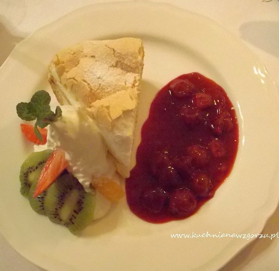 Na deser J. wybrał sernik z rosą podawany z wiśniami w syropie (17 zł). Ten sernik uwielbiam i szczerze mówiąc jak mamy ochotę na coś słodkiego będąc w Rynku, kupujemy go w cukierni Hawełki przy wejściu od Rynku.