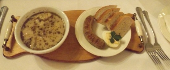 Jako zupę J. wybrał żurek krakowski na desce podawany z białą kiełbasą, jajkiem i chrzanem (18 zł). Pyszny dobrze doprawiony, biała kiełbasa usmażona na patelni do tego jajko z dodatkiem chrzanu.