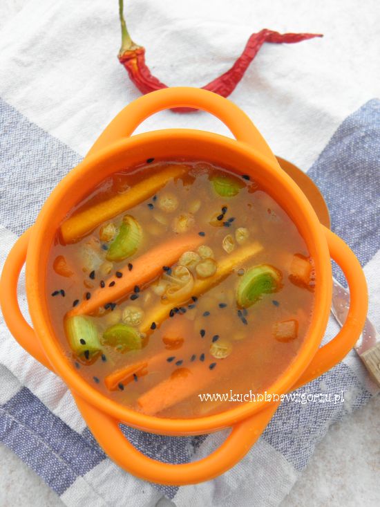 Kolejna odsłona lubianej przez nas zupy z soczewicą i imbirem.Zupę robi się szybko, zupa też szybko znika. Ugotowałam garnek zupy wczoraj dzisiaj nie ma po niej ani śladu :)