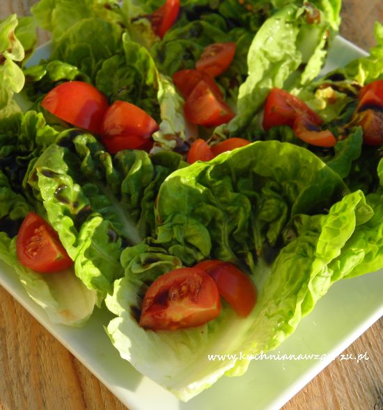 Sałatę rozdzielić na poszczególne liście, umyć, osuszyć. Pomidorki umyć, osuszyć, pokroić w ćwiartki. Oliwę wymieszać z octem i miodem. Na talerzu ułożyć liście sałaty, na nich ćwiartki pomidorków i porządnie skropić sosem. Podawać natychmiast, znika szybko.