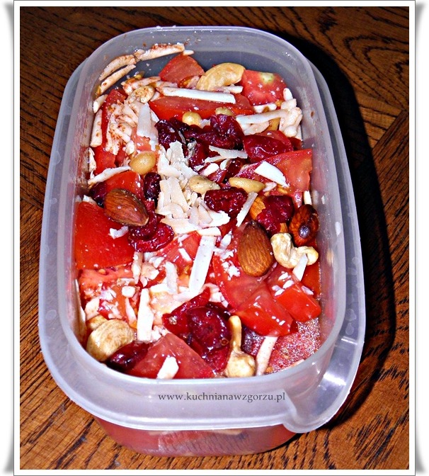 Do pudełeczka pokroić pomidory polać oliwą i octem balsamicznym, dodać mieszankę orzechów i żurawiny, posypać startym parmezanem. Zabrać do pracy. Zjeść w pracy ze smakiem.