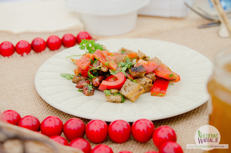 Boczek pokroić w kosteczkę i podsmażyć na suchej patelni, gdy zaczną robić się skwarki, dodać 2 drobno pokrojone ząbki czosnku i podsmażyć, podlać delikatnie 1/2 szklanki miodu i szybko zamieszać. Uwaga alkohol się będzie mocno ulatniał, dodawać powoli miód i mieszać, odparować alkohol. Zdjąć skwarki na talerz, do sosu na patelni wkroić masło i dodać tymianek, Pokroić papryki w kostkę. wszystko zamieszać. Do miski przełożyć podsmażone kosteczki chleba i boczek oraz paprykę. Dodać pokrojoną natkę pietruszki i polać sosem.