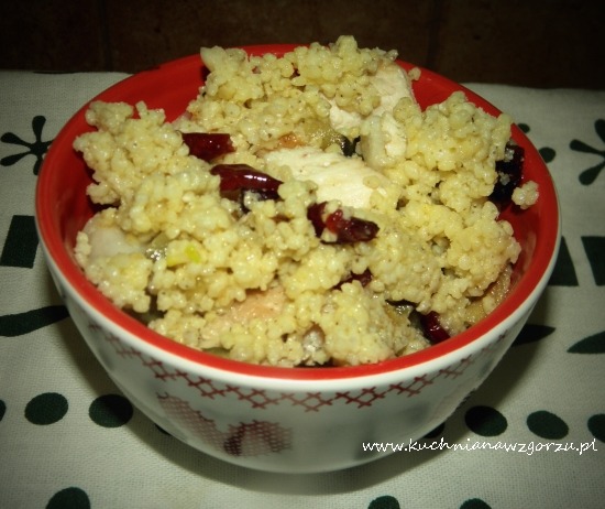 Do ugotowanej i odcedzonej kaszy lekko przestudzonej dodałam kurczaka, pokrojone w mniejsze kawałki cukinie , oraz pokrojone w kostkę daktyle i żurawinę. Wszystko wymieszałam z oliwą z pestek winogron.