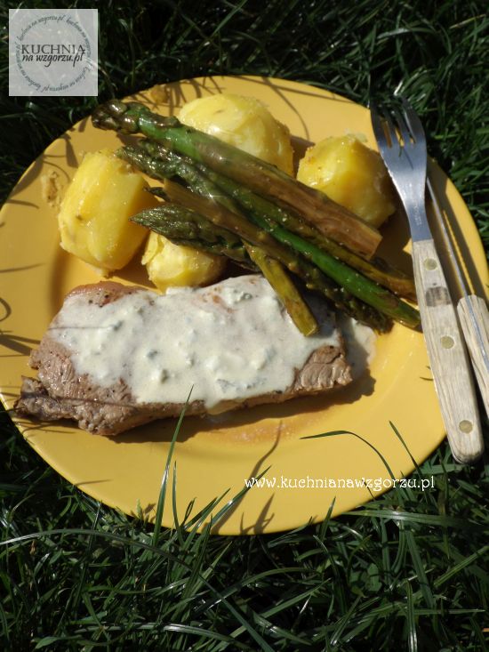 Nakładamy steki na talerz do nich dodajemy ziemniaki i szparagi, stek polewamy sosem i gotowe.